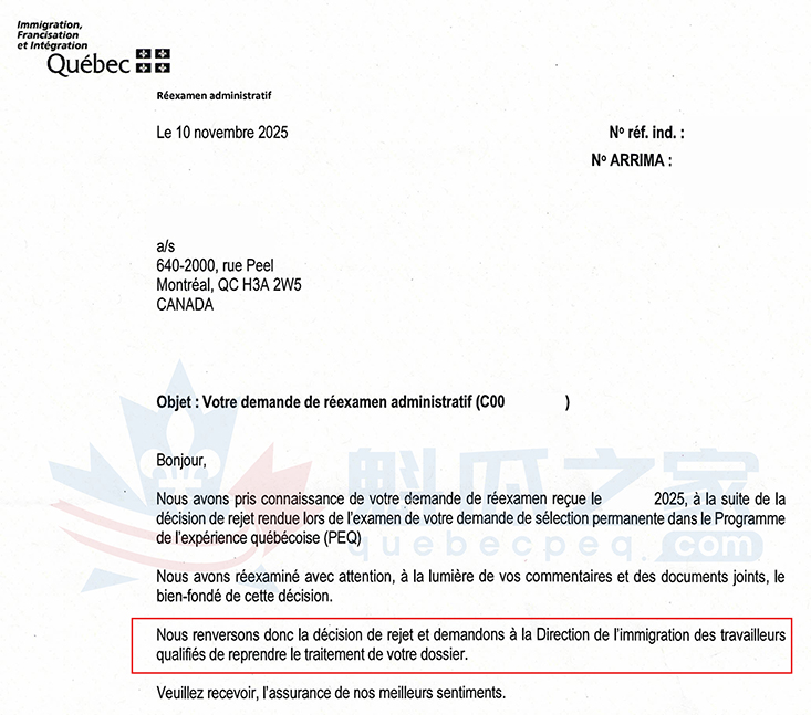 经过五个月的审核,魁省移民部行政复议部门最终向我们发来正式函件,确认推翻原拒签决定,撤回虚假陈述认定及五年禁令,并要求相关部门重新处理客户档案。这封 复议结果,意味着客户彻底摆脱了沉重且不合理的指控,移民道路重新被打开,也证明我们所坚持的专业态度与法理逻辑最终得到了MIFI认可。