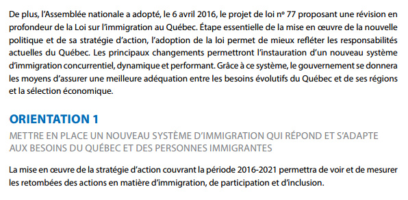 2016年4月6日,魁省议会通过了77号草案的修订,将引入更具活力、效率、竞争力的移民系统,保证匹配魁省各地区之间日益变化的需求。此移民系统将于2016年至2021年期间采用。并在下文中详细介绍了EOI系统的必要性和优势以及对魁北克经济、劳动市场的帮助。