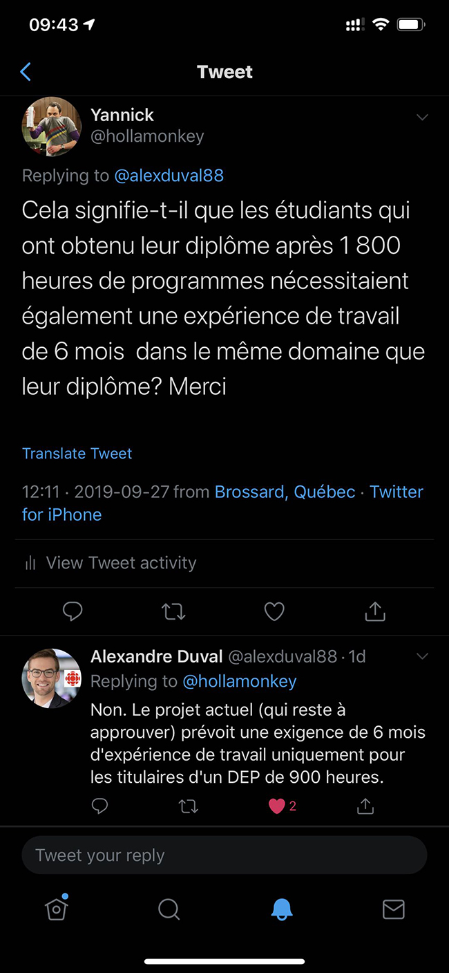 猴君在周五发表的文章【PEQ项目或将被收紧 多项修改细节已透露】中,由于原文中描述900学时职业培训课程申请移民需要工作经验时使用了aussi词汇,这使得很多人对于1800学时是否也需要6个月的相关工作经验产生了极大的忧虑。当日,猴君与多位法语母语人士确认文字的意思,得到的仍然是两种不同答案。于是猴君第一时间联系了CBC报道的原文作者Alexandre Duval先生并随后得到了准确的答复,即只有900学时职业培训课程毕业的学生在未来申请留学类PEQ才需要6个月相关工作经验,也就是说1800学时专业毕业的学生保持原有申请条件,暂且无需担心。